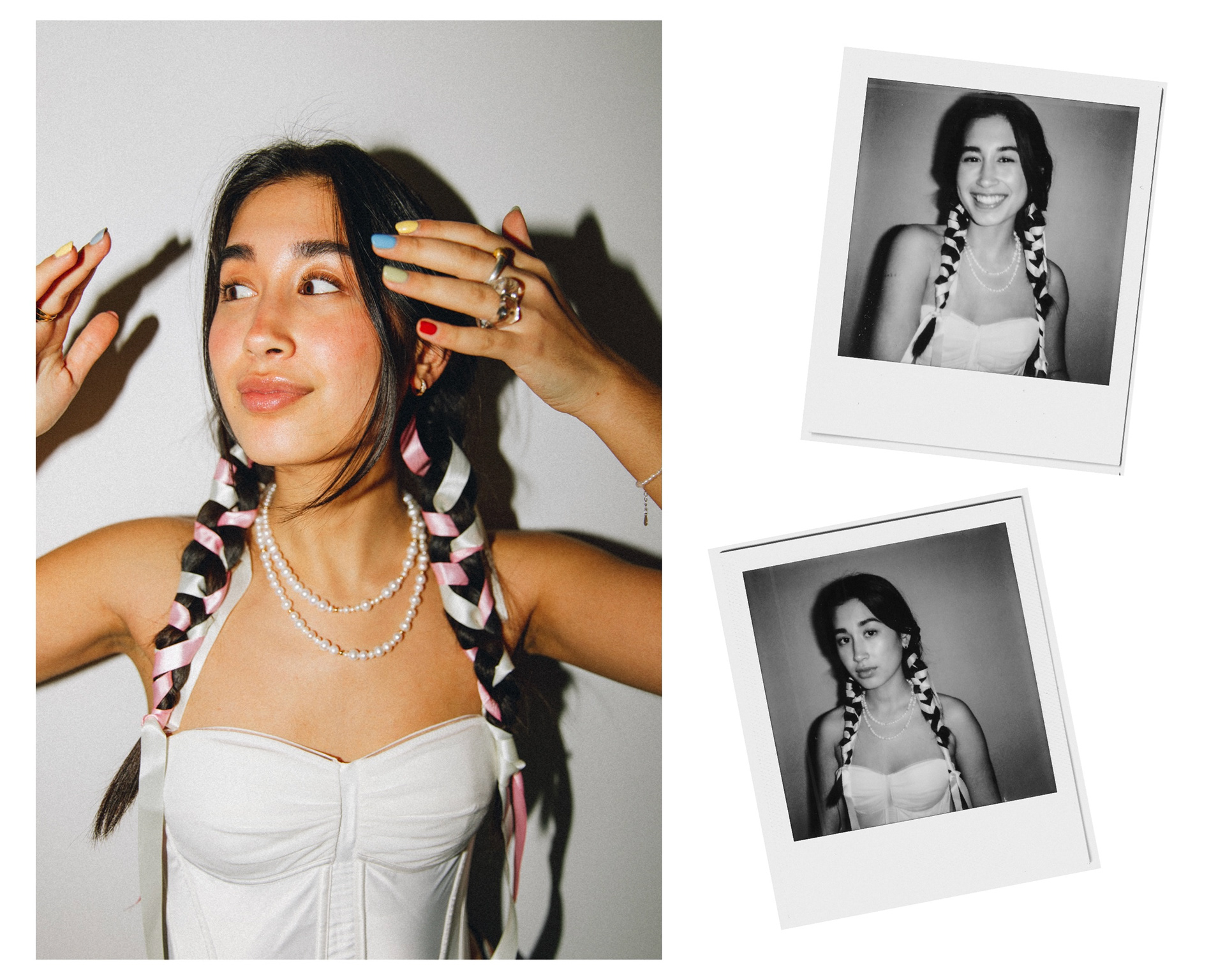 Pictures of model Moya Mawhinney through different media, such as instant photographs and digital shots.