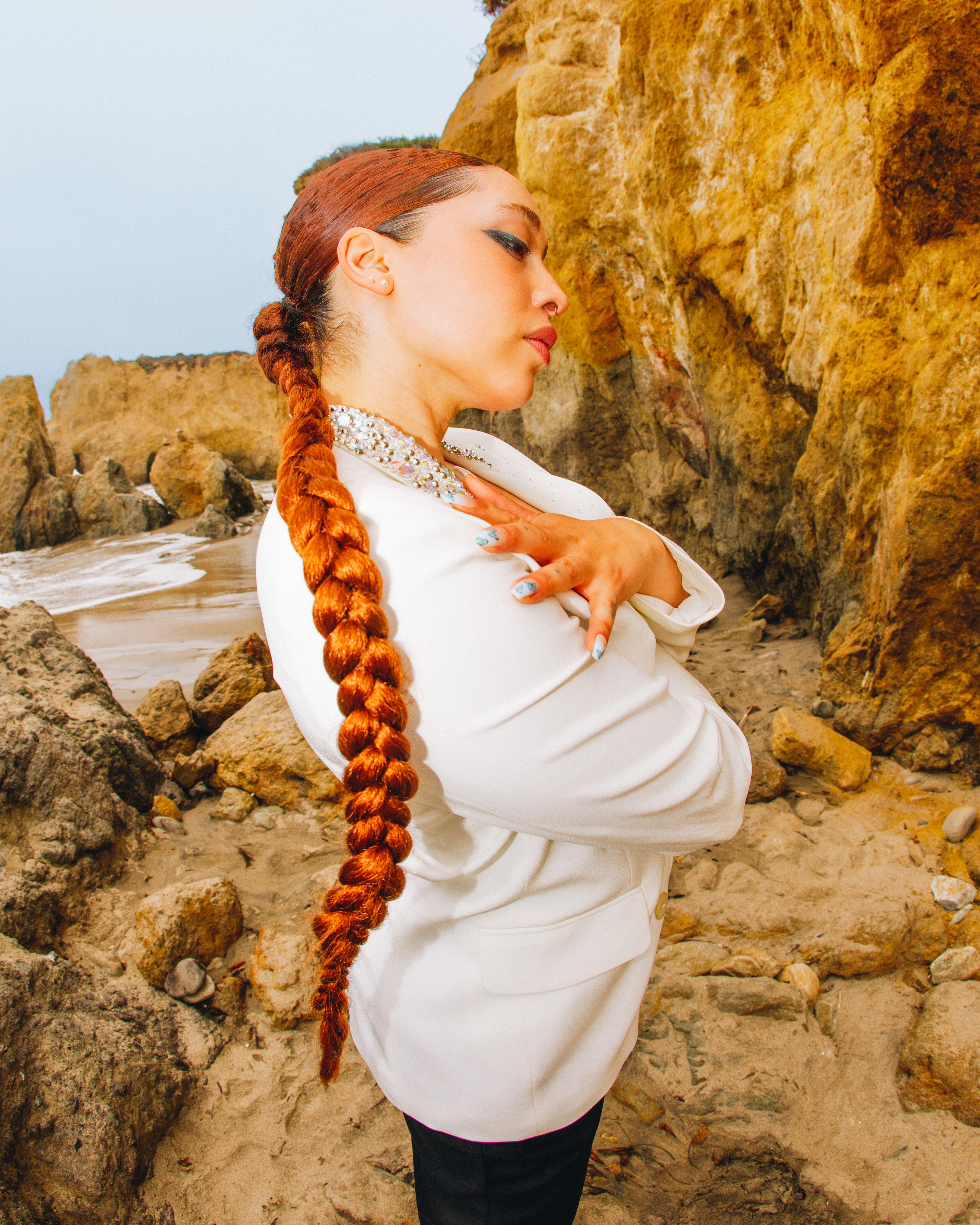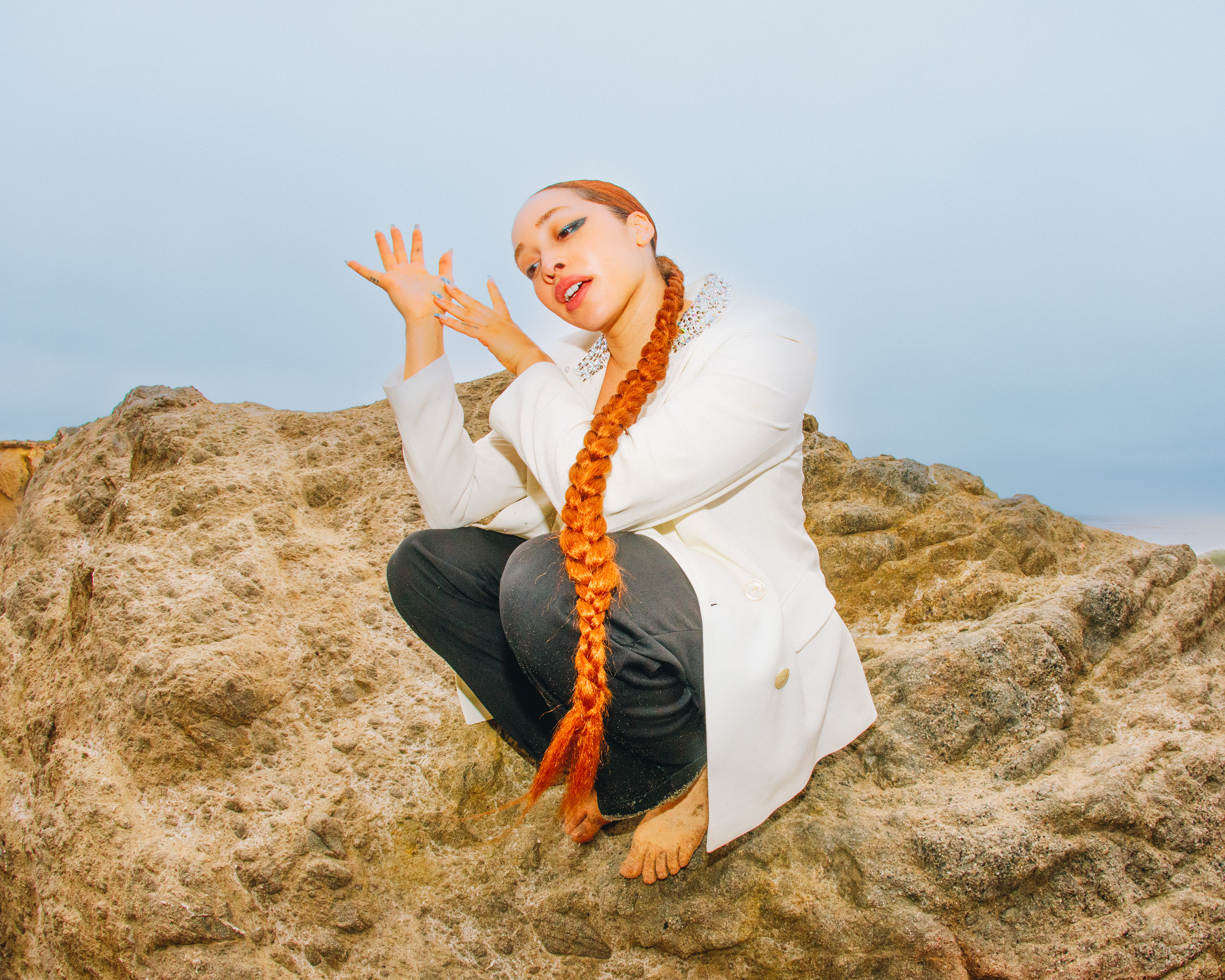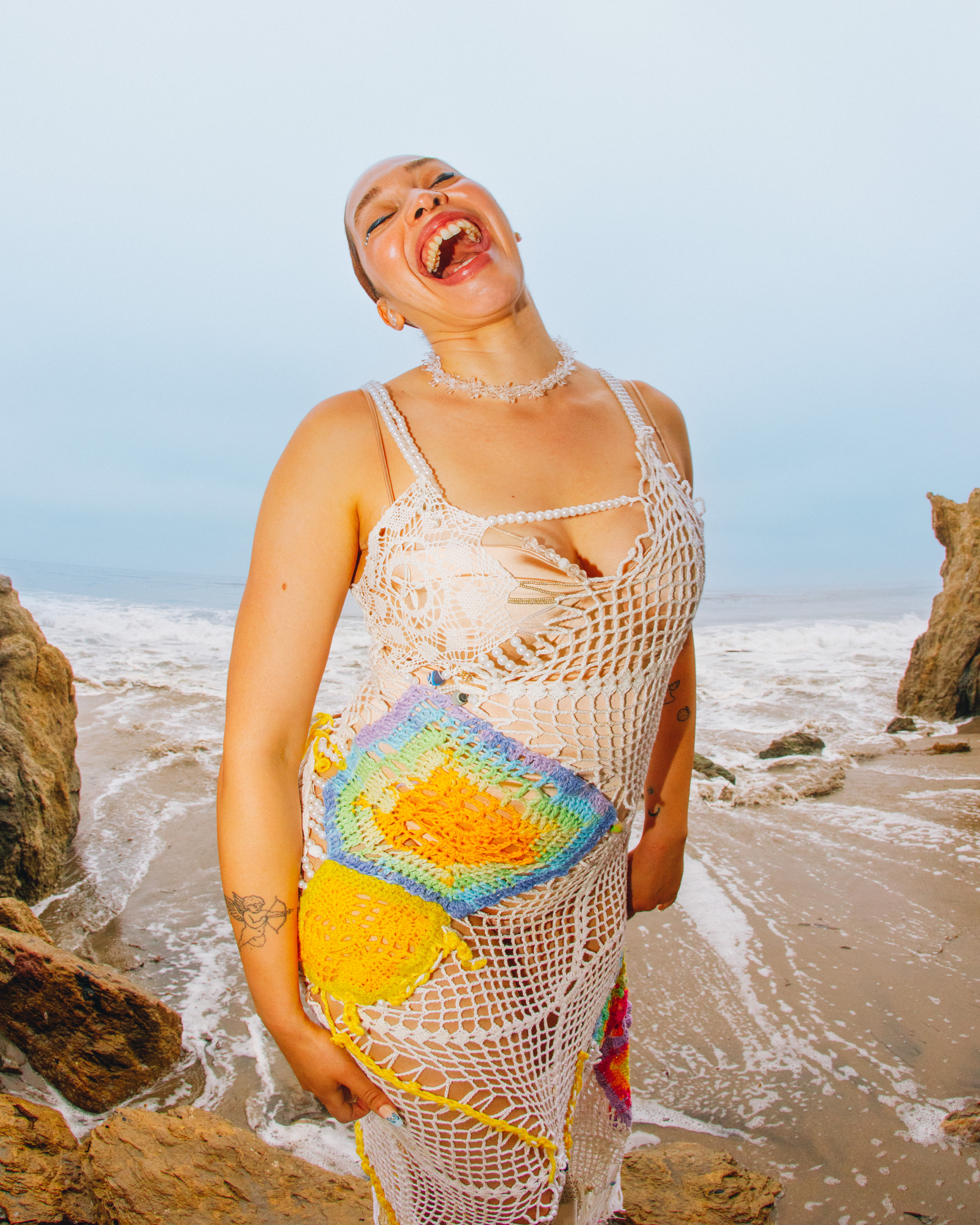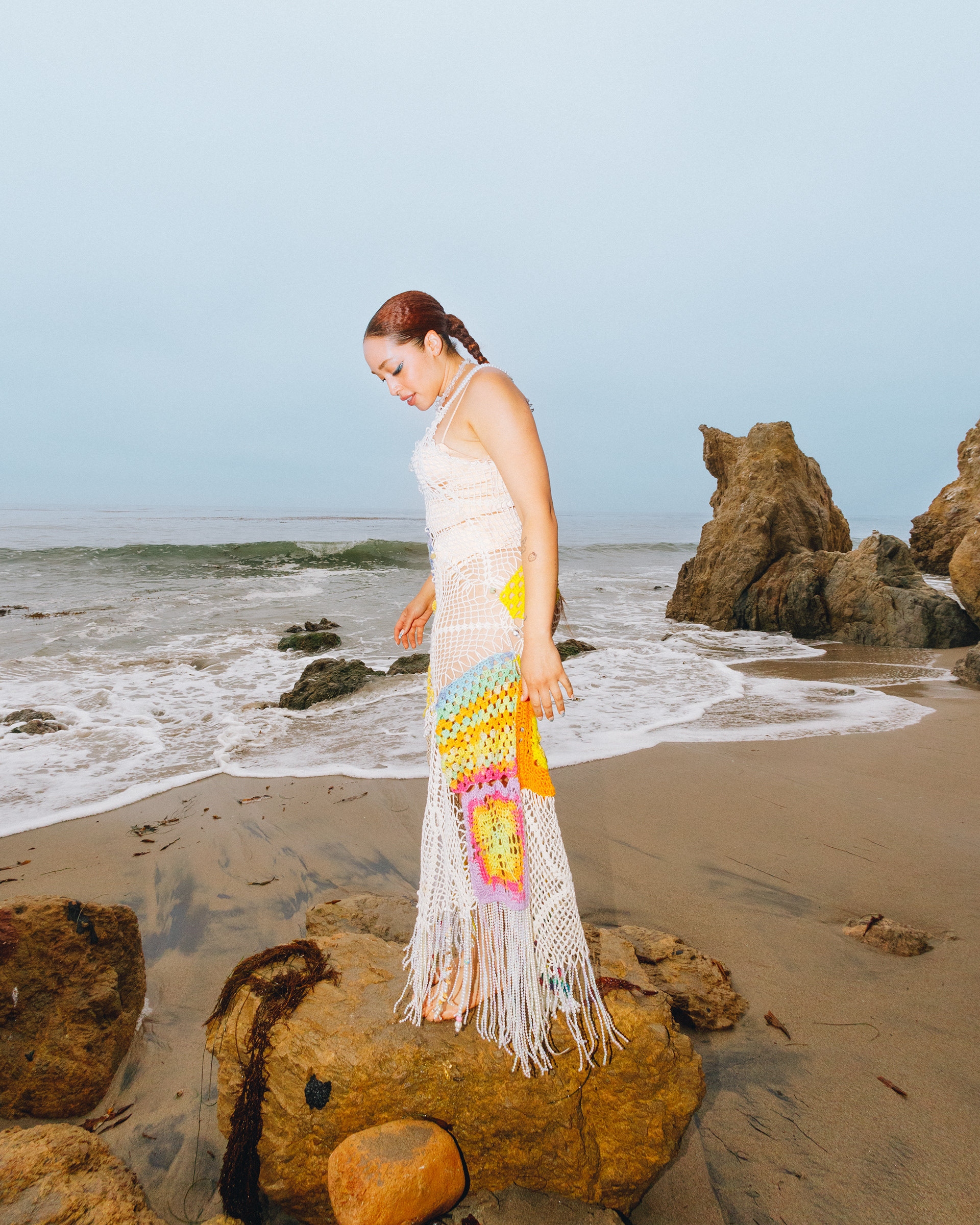 Press photos for singer Sister, shot in Malibu. Sister is wearing a dress she made herself while posing in this delicate and natural setting.